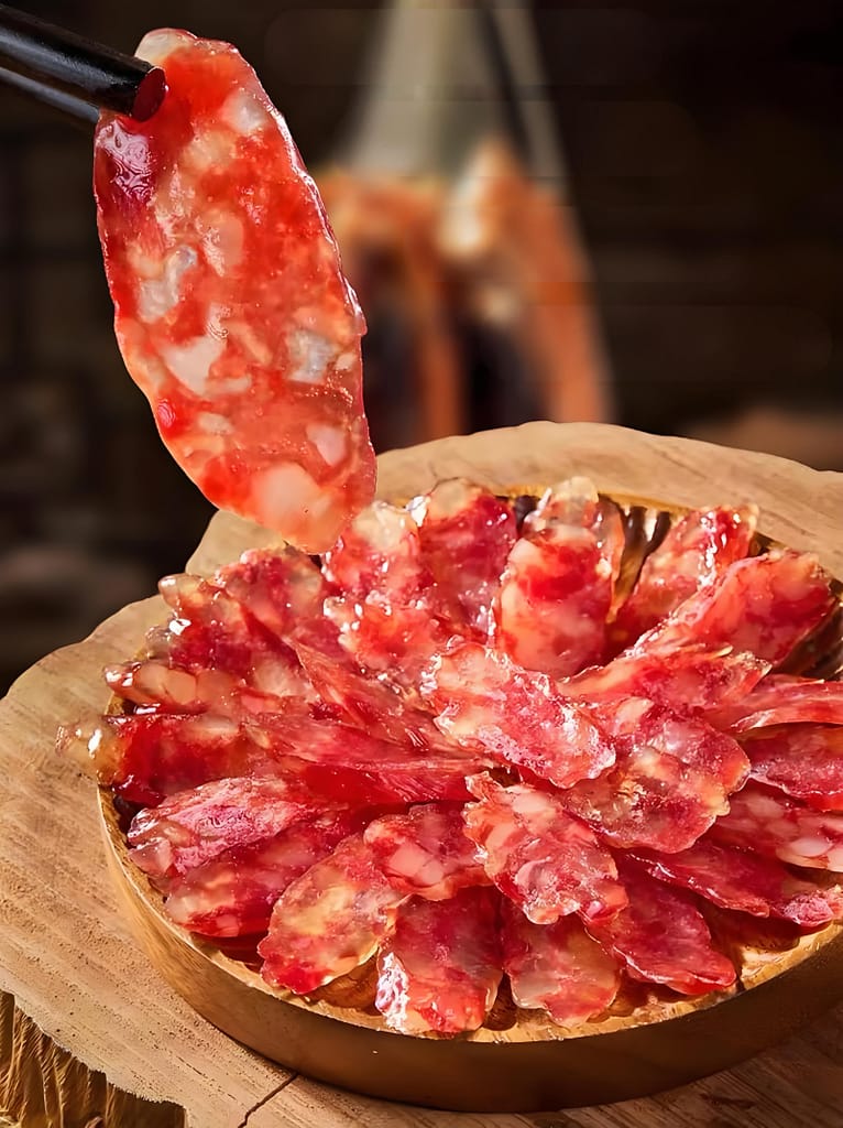 3.热锅凉油,爆香蒜末,下腊肠炒至透明出油。